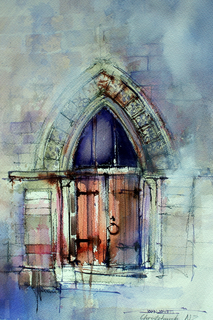 A warm sunny day greeted us in the beautiful city of Christchurch. This is the side door to Christchurch cathedral. It is hard to believe, just a week later the city was hit by a devastating earthquake. The cathedral spire crashing to the ground where we painted.
