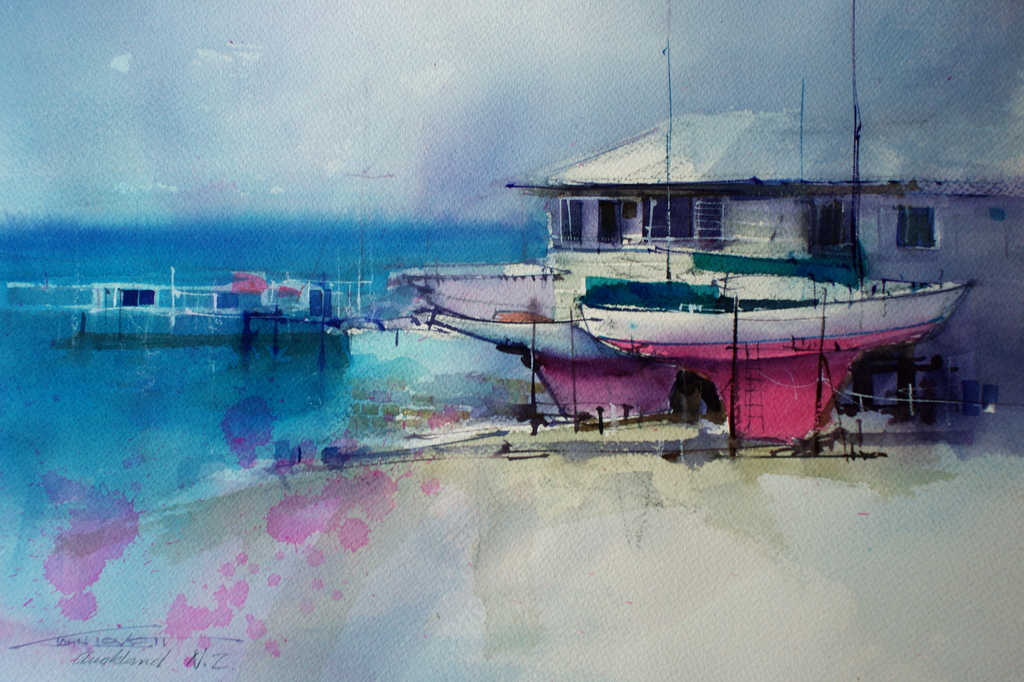 We found a busy boatyard on Auckland Harbor and spent a day painting there. They say Auckland has more boats per head of population than any other city in the world.