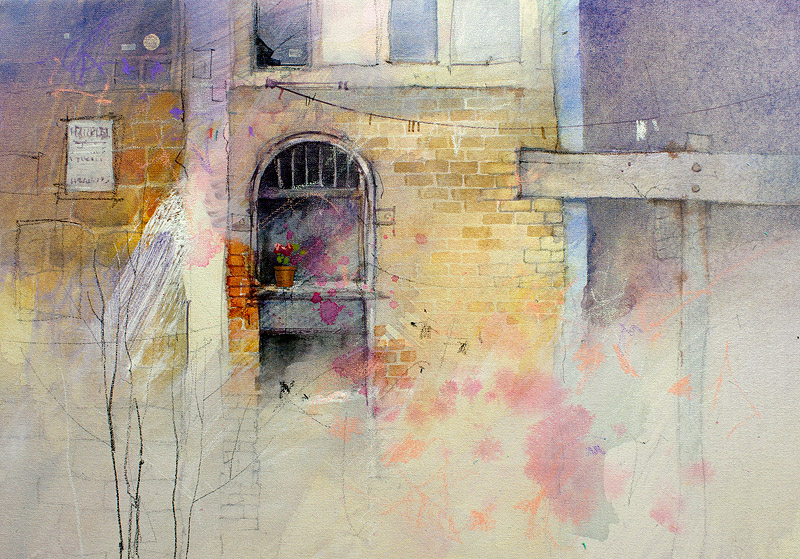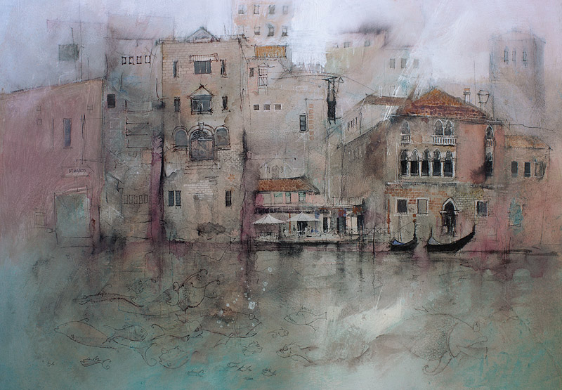 (530×760 mixed media on 600gsm paper) Tiny glimpses of life in the milky backwaters of Venice. This painting was done on heavy paper and mounted down on a gesso primed board using acrylic medium. It was finished with a satin acrylic varnish
