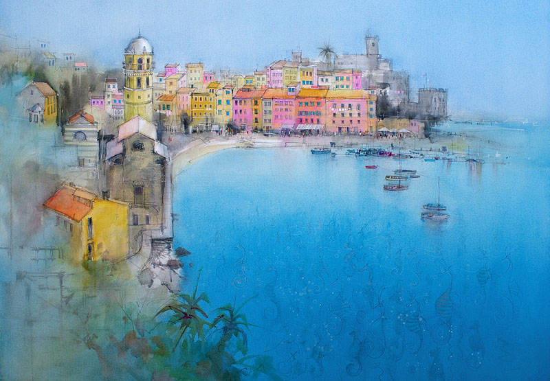 (900×1200 mixed media on watercolor canvas) The quaint and picturesque villages of the Cinque Terre attract crowds of magnificently decorated visitors.