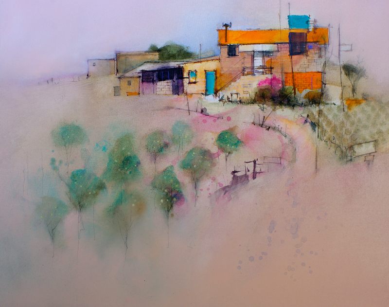 (600×760 Watercolor and mixed media on watercolor canvas) A Sicilian farmer coaxes lemons, olives and cabbages from a dry dusty hillside.