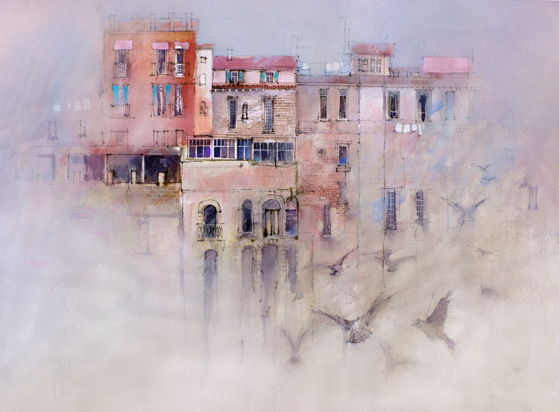 (530×760 watercolor, ink, charcoal and Gesso on textured paper) A flock of pigeons cut spiraling arcs against the formal, geometric facades of ancient buildings.