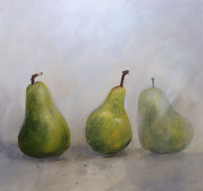 (590×630 mixed media on board) The risk of jumping the orchard fence makes even the greenest pears taste good.
