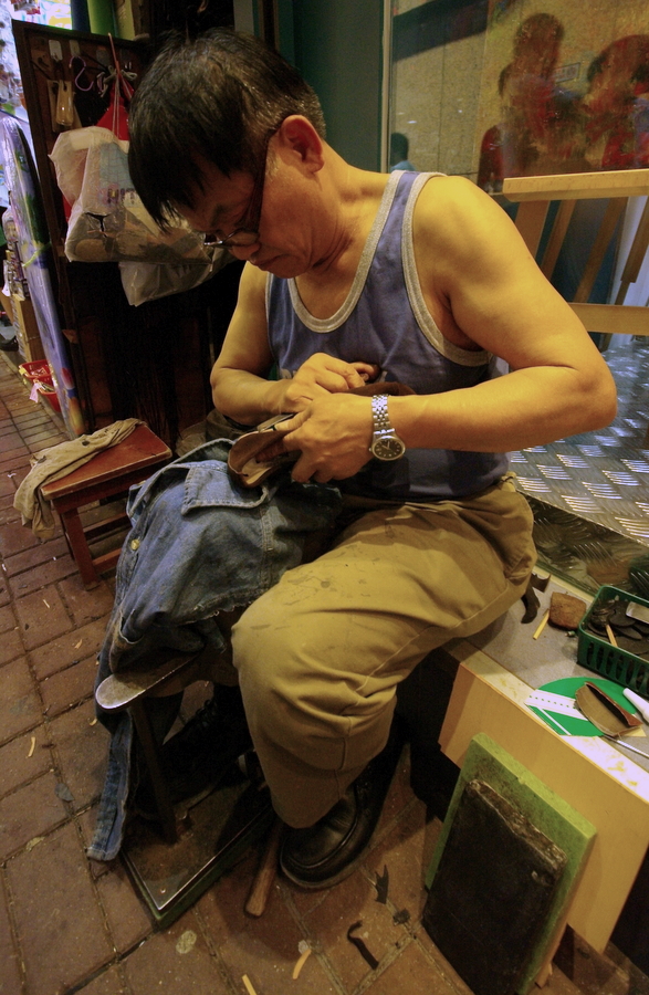 This man, sitting on a tiny stool with a handful of tools, will fix up your worn out shoes in next to no time for a couple of dollars.