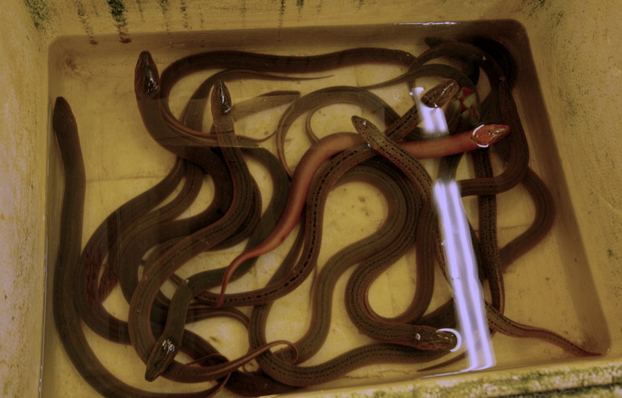 For me, the most fascinating area of the city is the food markets, which in the Mon Kok district seem to blend with the bird, goldfish and pet markets. These live sea snakes fall into the food category.