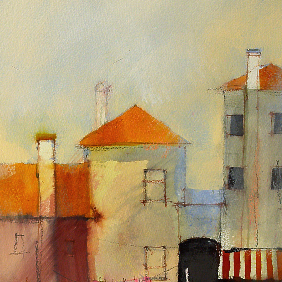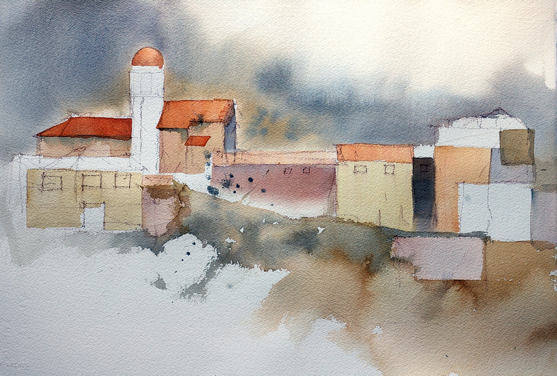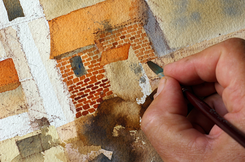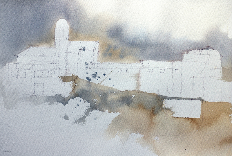 Starting loosly with a big brush and no preliminary drawing, then adding detail as the painting progresses.