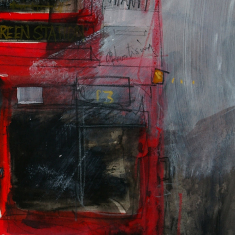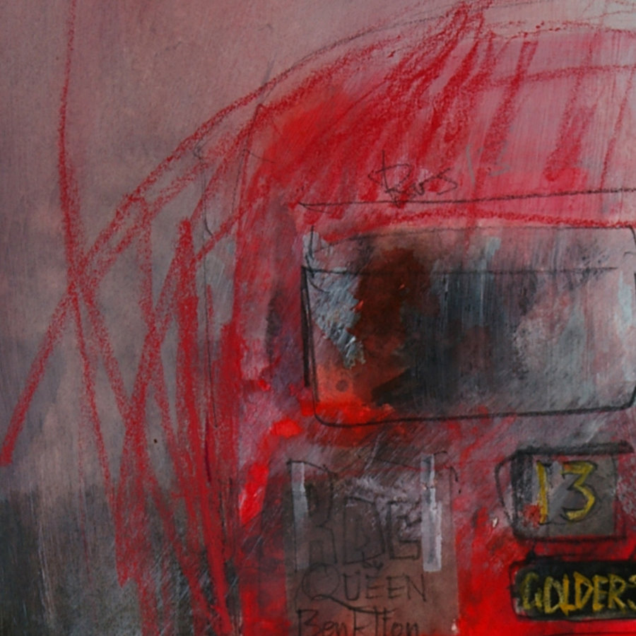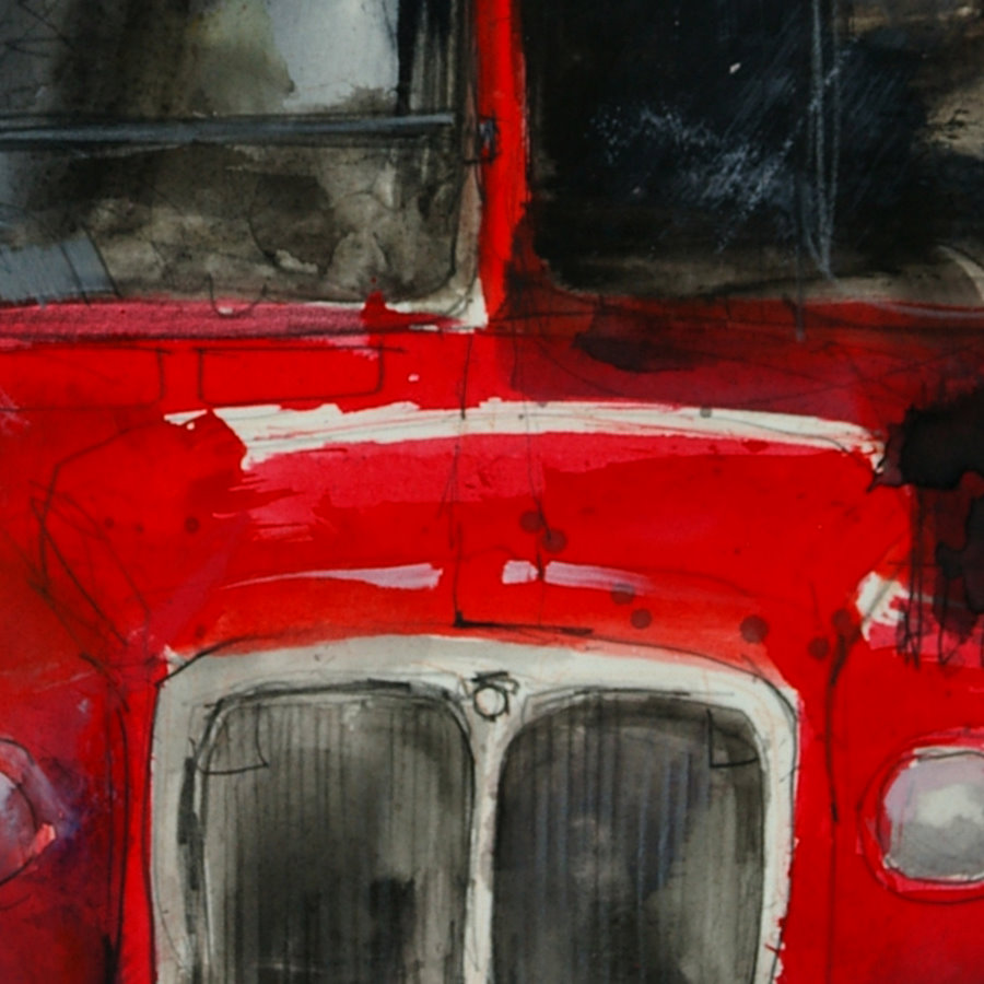 Red Shoes – Sketched with a charcoal pencil then colored with a red, orange and pink crayon. After the crayon was applied, a wet 1/2″ brush was used to dissolve and blend the colors. Finally a few red ink lines were drawn on and sprayed with a mist of water.
