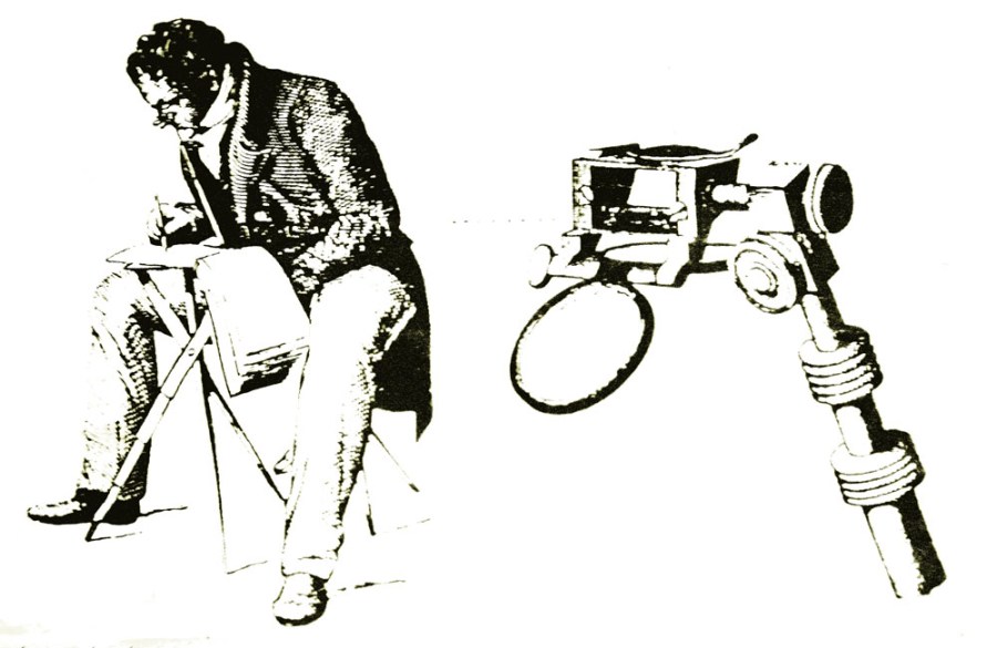 Today, the common pose of someone taking a photograph is two arms outstretched, camera gripped at arms length. This replaced the camera pushed to face, squint through viewfinder pose created by the invention of roll film. I wonder if the pose above, with the camera lucida and folding stool, was a common site through the 1800’s?