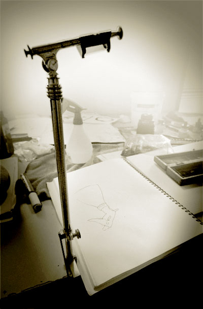 There is something irresistible about things in little wooden boxes. A friend lent me this old Camera Lucida to play around with. It’s an amazing device that allows one eye to see an inverted image of what ever is infront of you while the other eye sees your sketch book. Once the device is set up it is a simple matter to trace what ever you are looking at onto the sketch book.