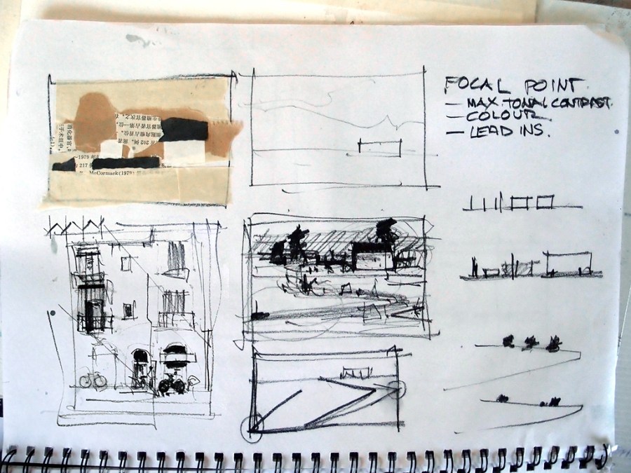 Thumbnail sketches and simple monochrome collages were used to simplify and rearrange our subjects.
