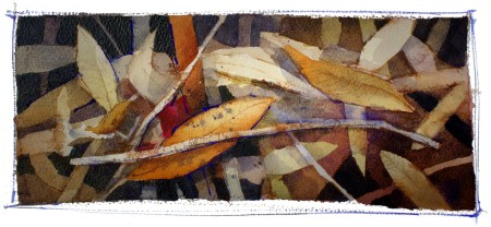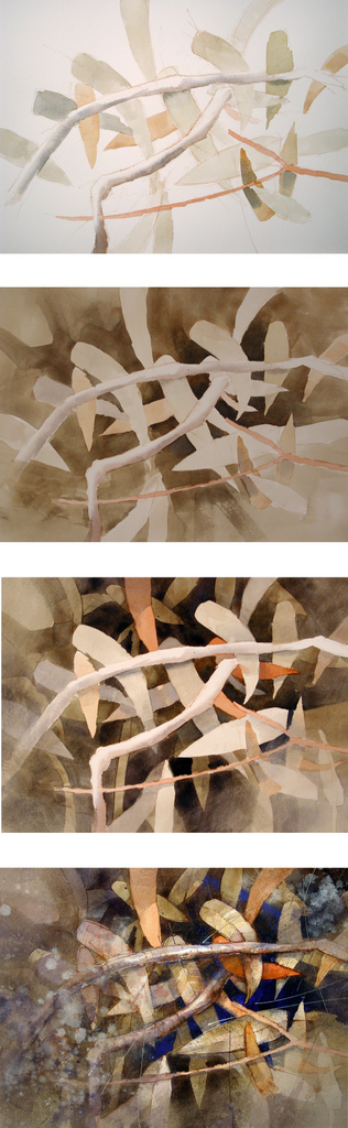 During the last workshop we experimented with a technique that produces interesting results if it doesn’t drive you mad first. The idea is to start with a background wash, draw the shapes of stones, leaves and twigs onto it, then, with a slightly darker tone fill in all the negative spaces. More leaves, twigs etc are then drawn into the darker negative areas and the negative spaces around the new shapes is made slightly darker. This incremental darkening is done 3-4 times then the shapes are modeled, ink and pastel lines are added, colors splashed on and gesso washes are used to simplify areas.
