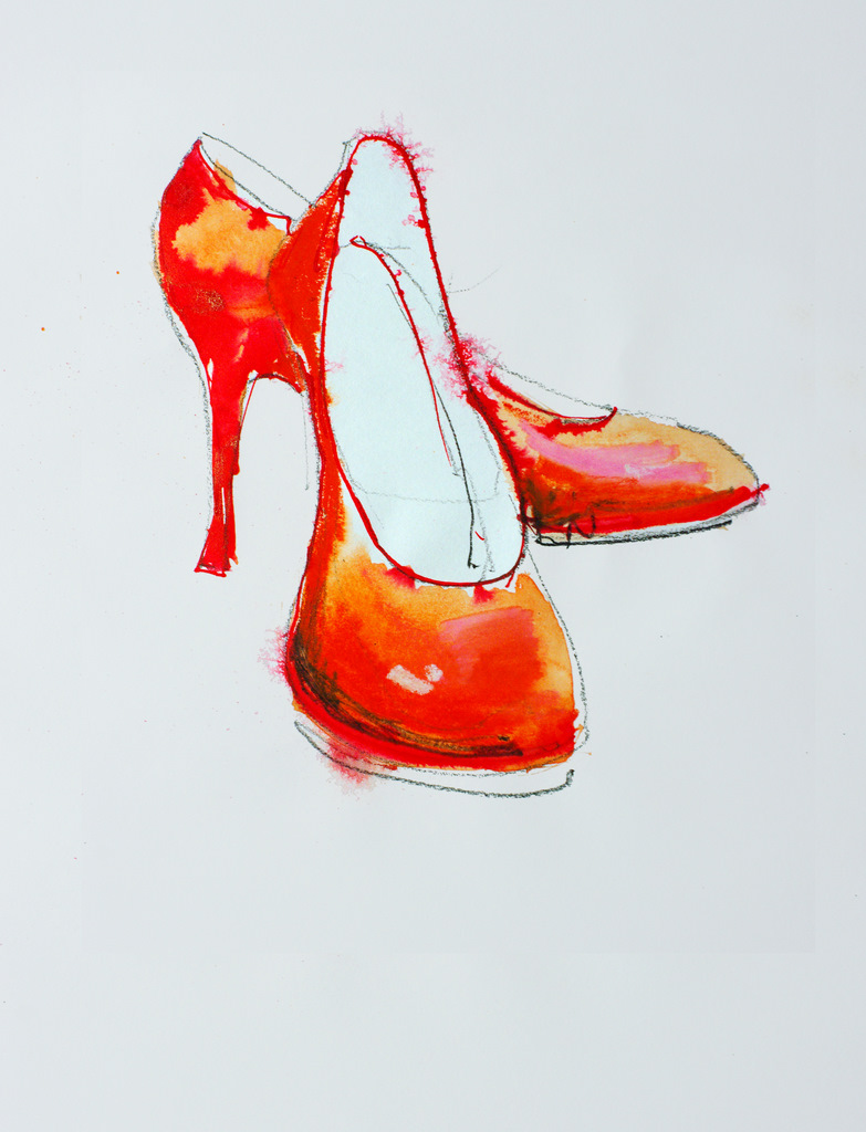 Red Shoes – Sketched with a charcoal pencil then colored with a red, orange and pink crayon. After the crayon was applied, a wet 1/2″ brush was used to dissolve and blend the colors. Finally a few red ink lines were drawn on and sprayed with a mist of water.