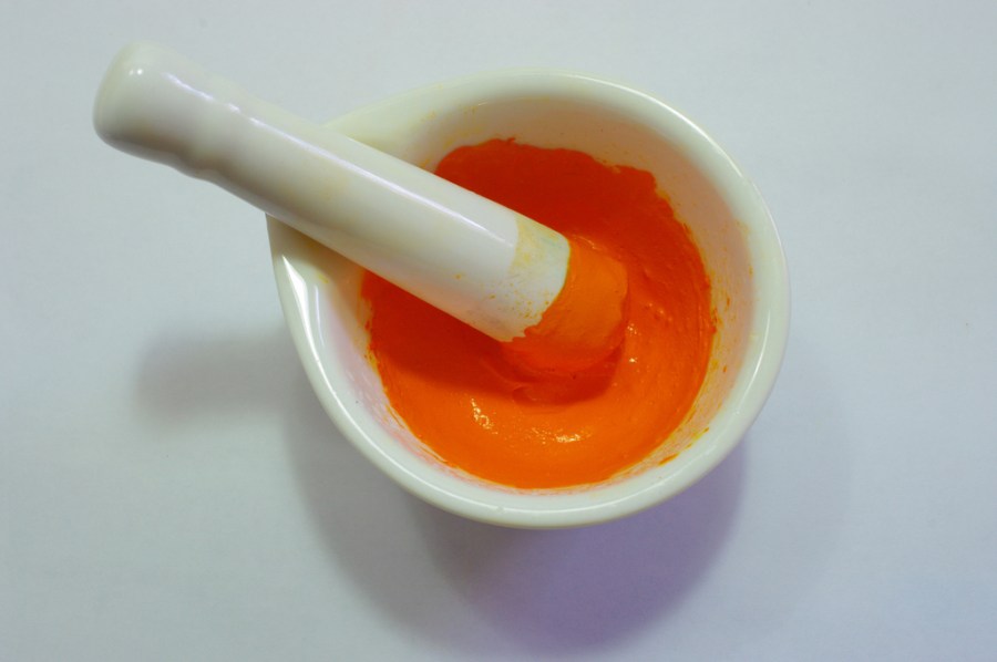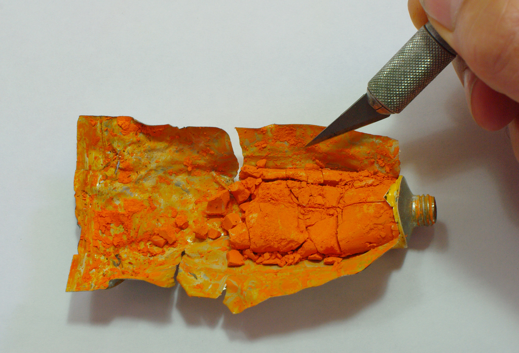 The first thing to do is cut open the tube and empty the dry lumps of pigment into the motar