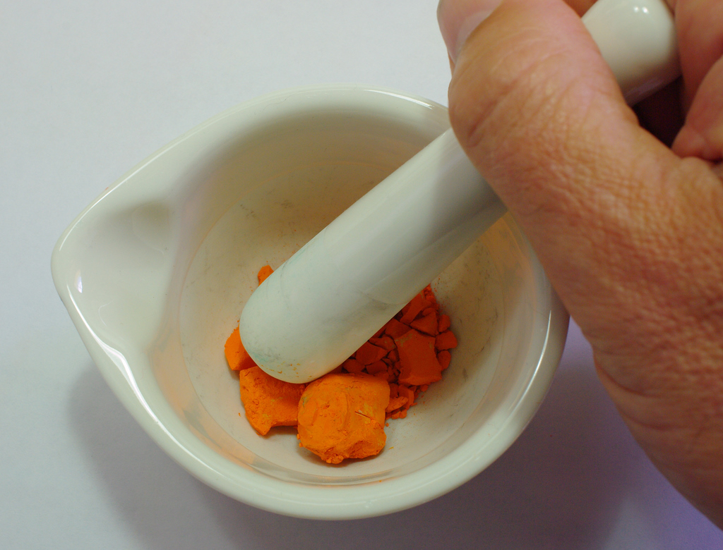 Next step is to grind them to a fine powder. The pigment sticks to the pestle, so a metal palette knife is handy to scrape and loosen the pigment.