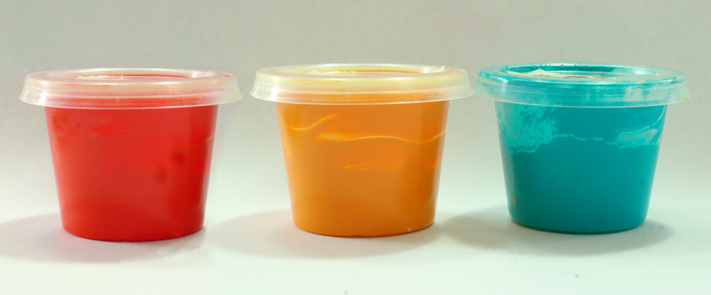 The final step is to scoop the recycled paint into a container. These little plastic sauce containers come from the local Thai restaurant – a couple of dollars for a plastic bag full. A piece of masking tape with details identifying the brand and color is a good idea before you throw away the empty tube.