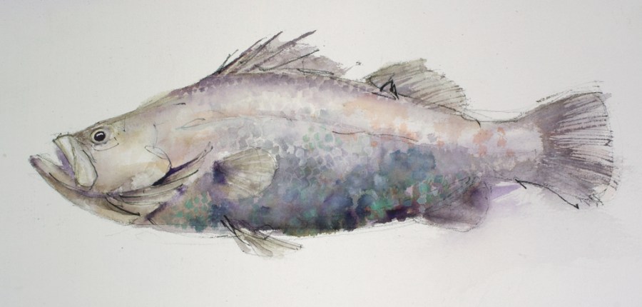 Finally, because the Barramundi is an elusive, almost mythical fish, I decided he shouldn’t be presented so blatantly. A big rough brush full of gesso and some scribbly white charcoal marks pushed him back into murky water. A green/grey wash around the head suggests the milky green of a tropical waterhole.