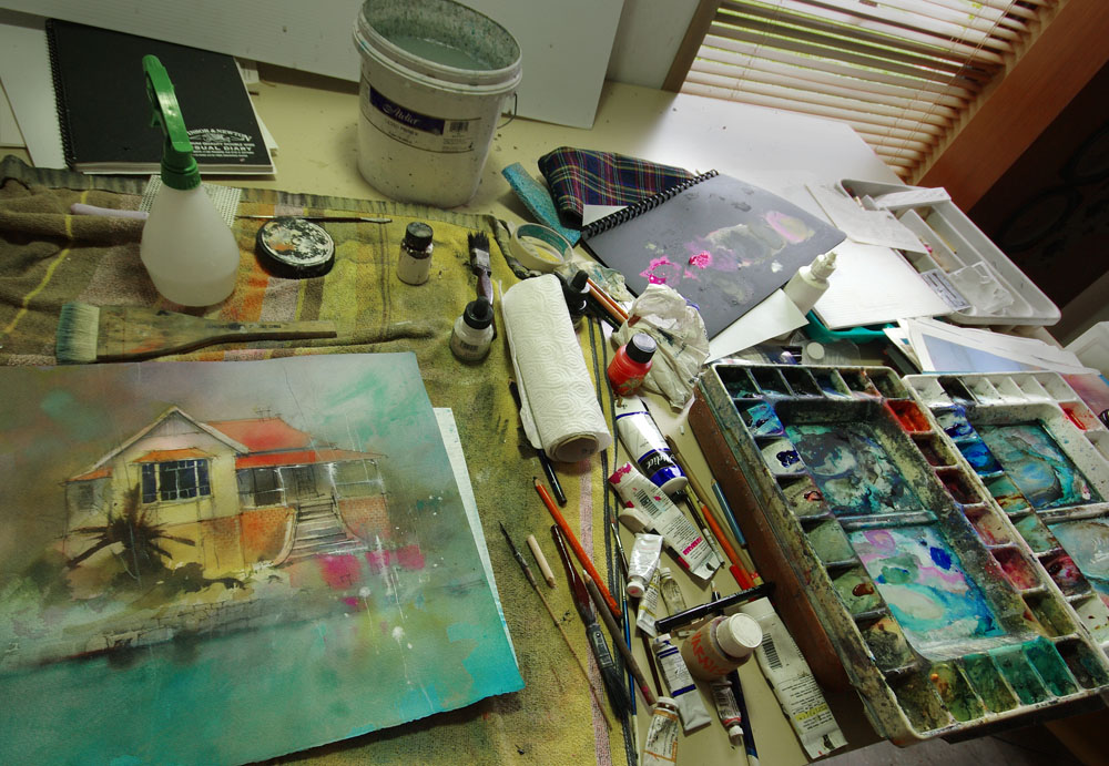 Traveling and painting on location requires a trimmed down, portable collection of paint, brushes and accessories. Everything, including a small folding stool, should be easily carried in a small backpack.