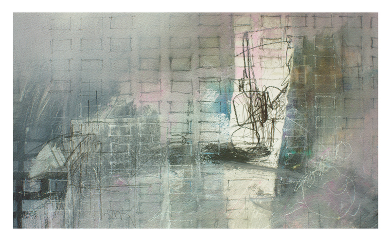 This painting was built up in layers of watercolor and gouache then worked over with thin glazes of gesso. Lots of calligraphic charcoal and pastel pencil marks were then threaded across the surface similar to graffiti on a wall.