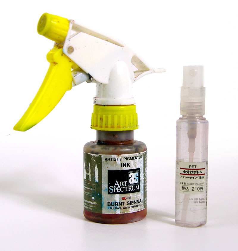 Small atomizer type sprays are best for traveling. If you can’t find one of these, cut down the tube on a normal spray bottle to screw onto a smaller container. This one is screwed on to an old ink bottle.