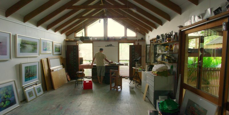 Five months traveling and three workshops, without the opportunity to restock, means a fair amount of paint, brushes and paper must be carried. I like to get as much done as possible in the workshops, so we usually complete 2-3 small paintings each day. At that pace the workshops alone will use up around 40 quarter sheets. Fortunately I only use a few colors (Indian Yellow/ Quinacridone Gold, Permanent Alizarin Crimson, Burnt Sienna, French Ultramarine Blue and Phthalo Blue) Half a dozen tubes of each of these plus a handful of other less used colors, Ink, Gesso, Gouache, a pile of brushes and pencils and things soon start to look like a mobile art supply store.