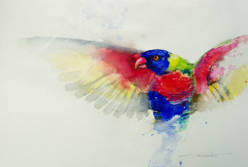 Painting these Lorrikets was a lot of fun – balancing sharp detail with loose suggestion. The wings and much of the body were roughly washed in with an old 1/2″ bristle brush. Detail was built up around the head and body with a 1/4″ flat brush and a #1 rigger. Finally the wings were attacked with gesso and a white charcoal pencil to get a feeling of movement.
