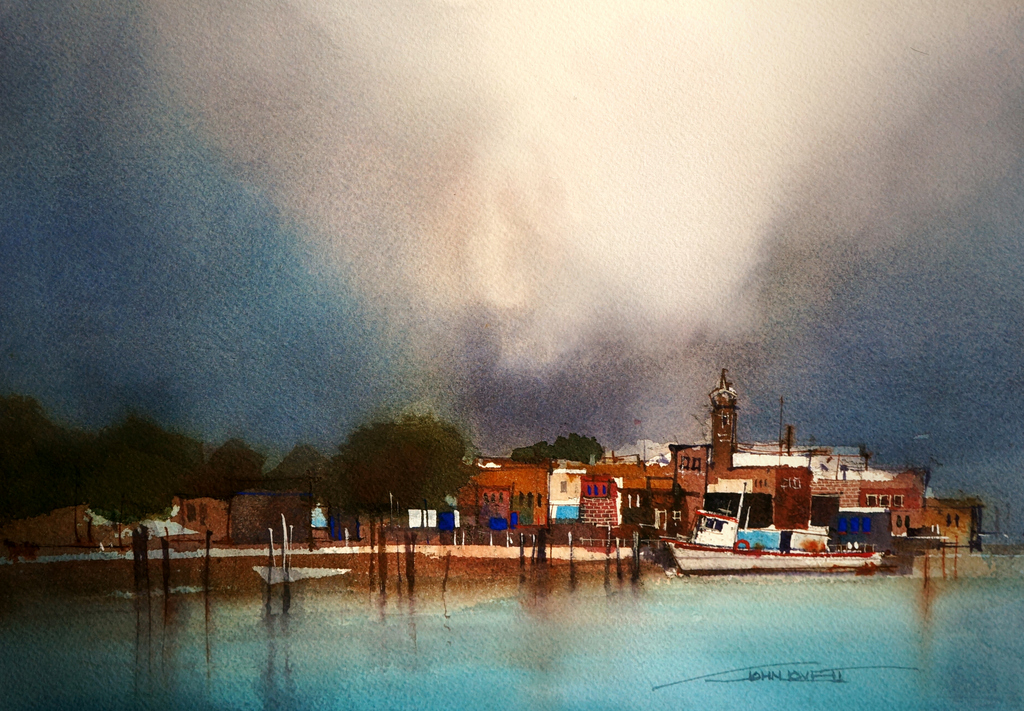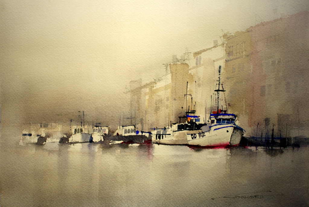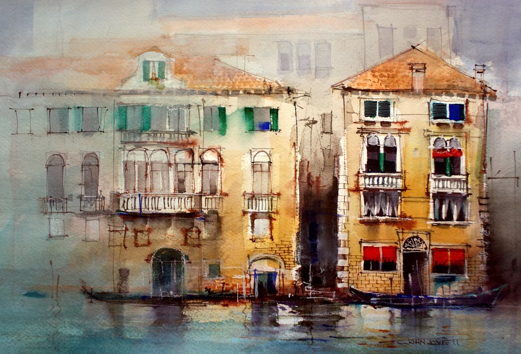 Not far from Venice is the small fishing port of Chioggia. These weather beaten trawlers make an interesting subject with their confusion of masts and rigging and the complicated backdrop of ancient buildings. The idea here was to suggest all the complicated detail without trying to carefully render it. We started with under washes of Permanent Rose and Aureolin and gradually built up detail over the tinted paper.