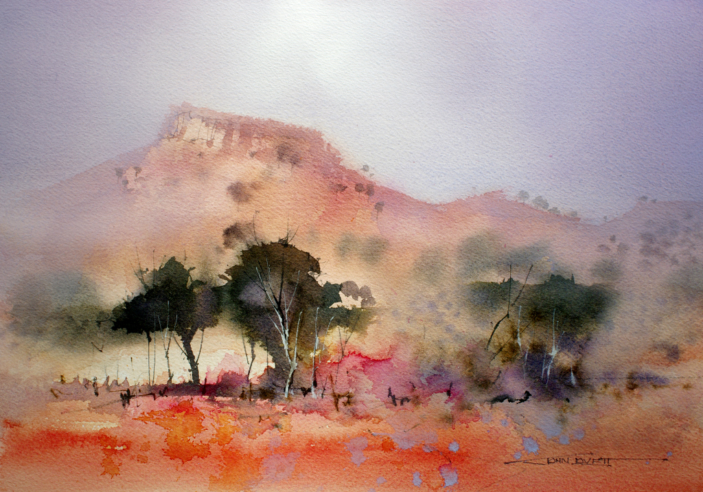 These two landscapes based on recent photos from Western Queensland were started with transparent washes (Quinacridone Gold, Cobalt Blue and Permanent Rose) Then the trees and other details were added with more opaque mixtures of Ultramarine Blue, Phthalo Blue, Alizarin Crimson and Quinacridone Gold. Graded washes were used on either side to create a band of light through the focal point, then various layers of gesso and White gouache glazes were worked through the sky and distance.